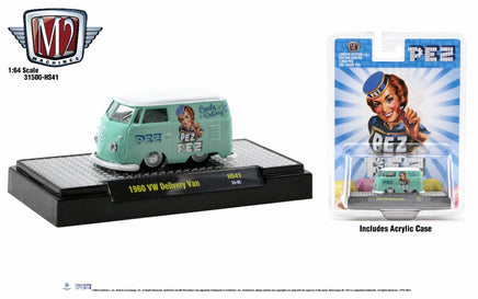 M2 Auto Thentics release HS41 1960 Volkswagen Delivery "Shorty" done in light green with a white roof and PEZ Candy tampos. Van is new in the clamshell, packaging may have some shelf wear.