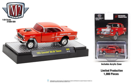 2024 M2 Machines S09 Motorama Productions 1955 Chevrolet Bel Air Gasser. A recreation of Gary Gallo's show winning '55. Created exclusively for Motorama Productions, limited to 1,000 pieces and is fresh from the case.